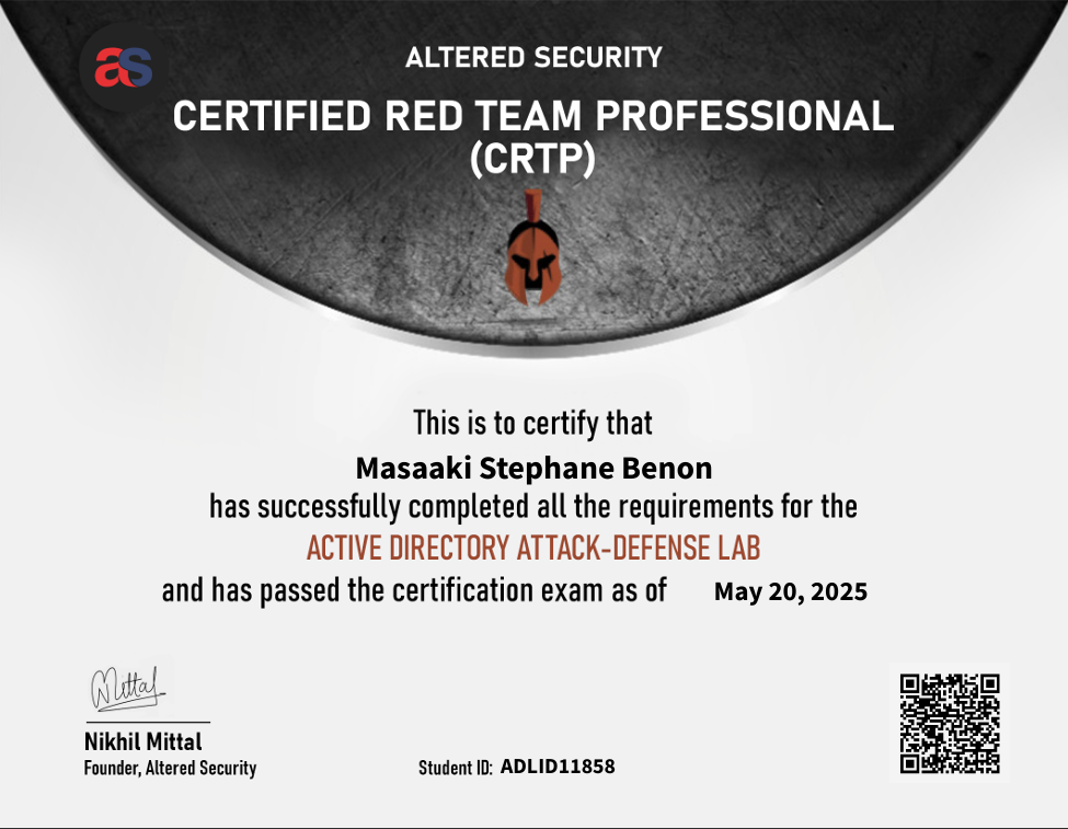 In addition to my development skills, I have hands-on experience in Ethical Hacking and Red Teaming. I hold the Certified Red Team Professional (CRTP) certification, which involves a rigorous 24-hour practical exam focused on hacking 5 computers within an enterprise Active Directory environment.